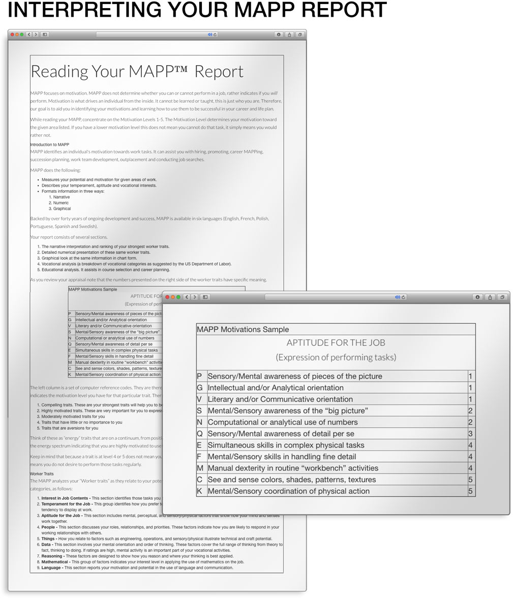 After completing the assessment, you can see your results immediately. But you won't want to stop there! A MAPP Package can uniquely help you find your ideal career. Your personal assessment results are scored against over 1000 jobs, and you can see what jobs are the best fit, along with the and you can see what jobs are the best fit, along with the education needed and career outlook.