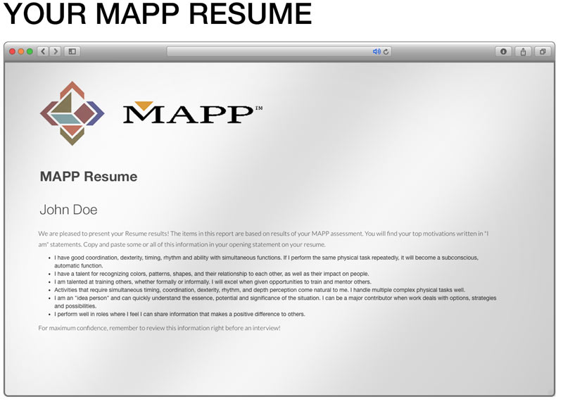 The MAPP™ career assessment is the first and most comprehensive career assessment online for consumers. More than 9 million people in nearly every country in the world have taken the MAPP assessment since its inception in 1995.